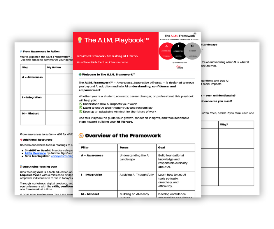 The A.I.M. Framework™ by Girls Teching Over helps students, professionals, and organizations build the awareness, integration, and mindset needed to thrive confidently alongside AI.